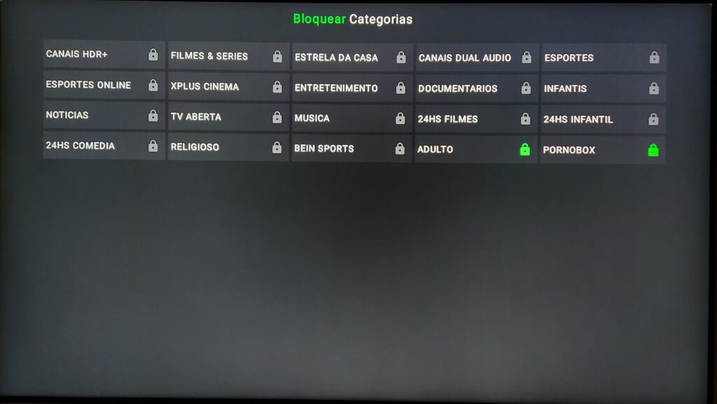 Após inserir a senha, você verá uma lista de categorias de canais. Navegue pela lista e selecione a categoria que deseja bloquear ou desbloquear. Ao selecionar uma categoria, ela será marcada como bloqueada, impedindo o acesso até que seja desbloqueada.